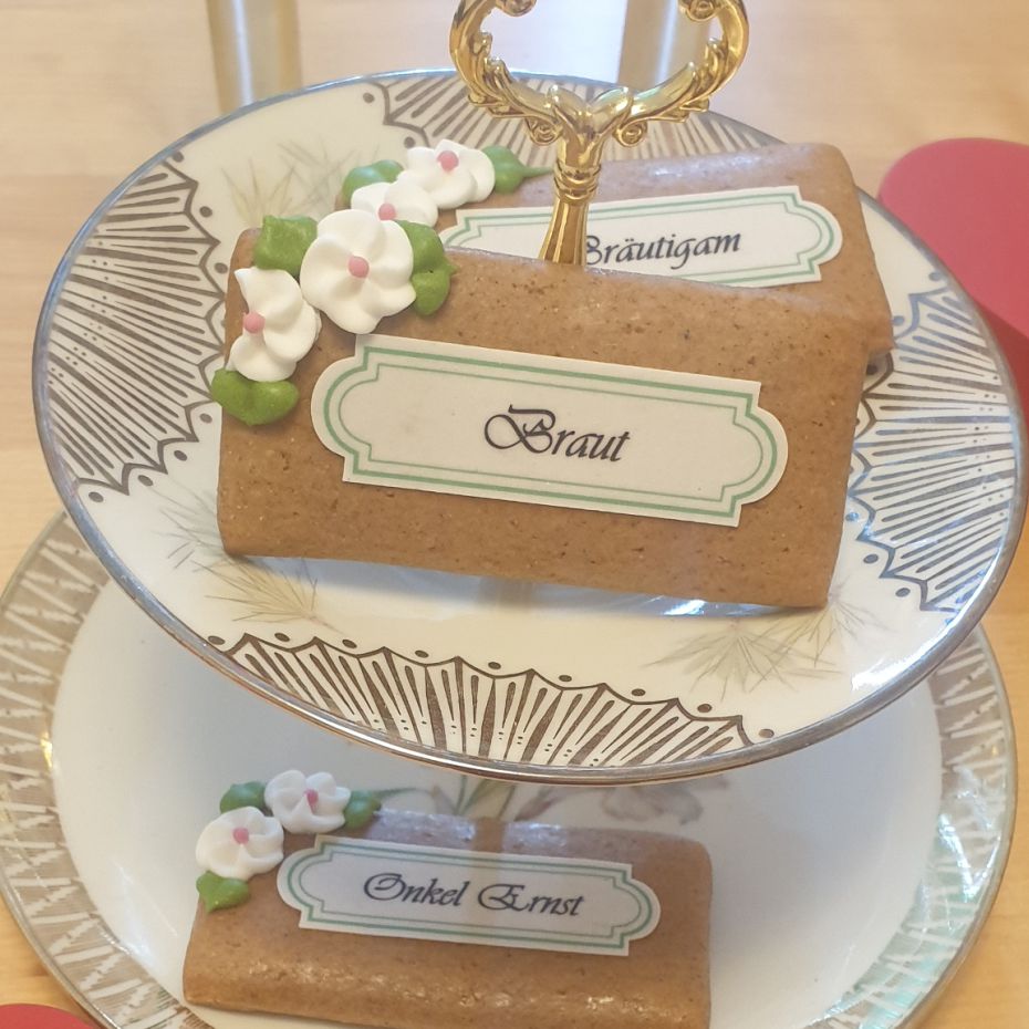 Sie erhalten Lebkuchen mit essbaren Namensschildern. Auf den Namensschildern stehen die Namen Ihrer Gäste.
