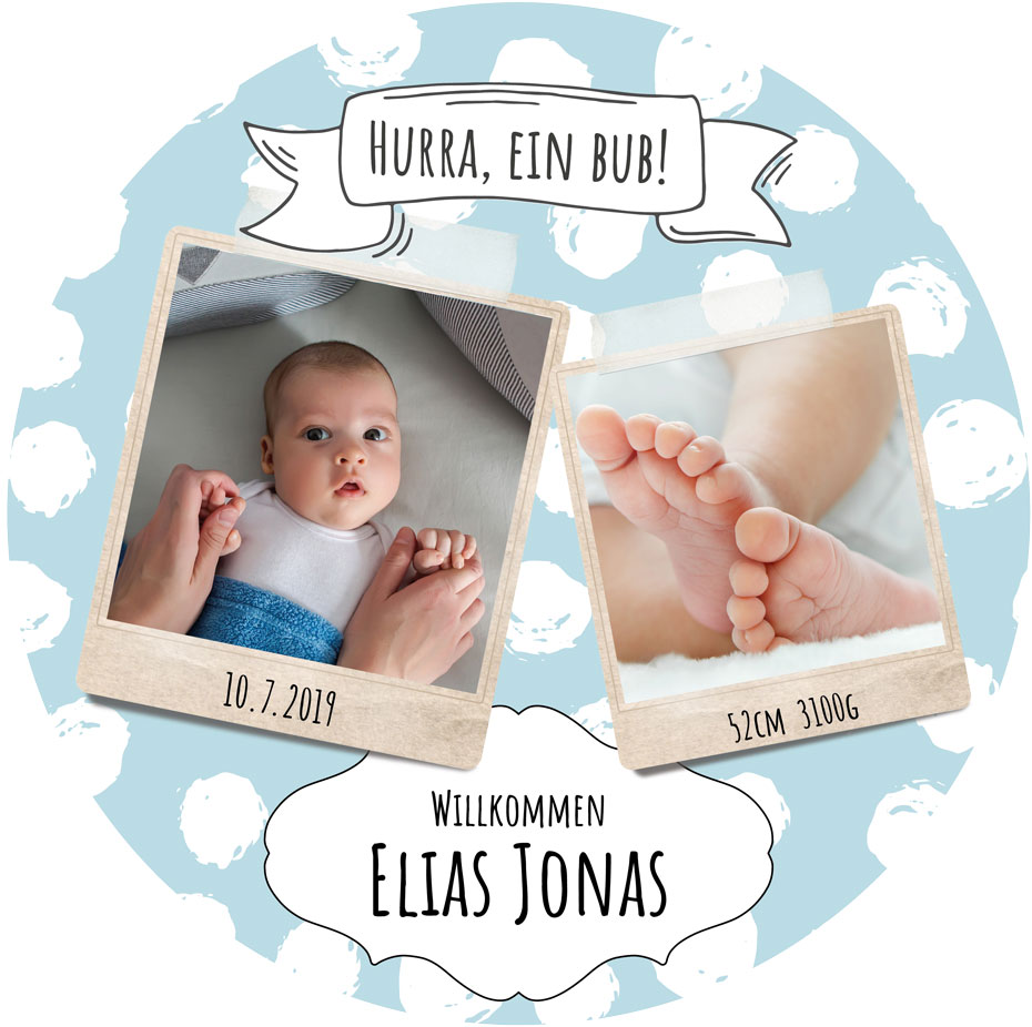 Bei dieser Vorlage können Sie die Bilder in der Vorlage mit Hilfe unseres Konfigurators selbst ändern. Der Text ist mit „Hurra ein Bub“ voreingestellt. Alle anderen Texte können Sie selbst mit dem Konfigurator ändern.