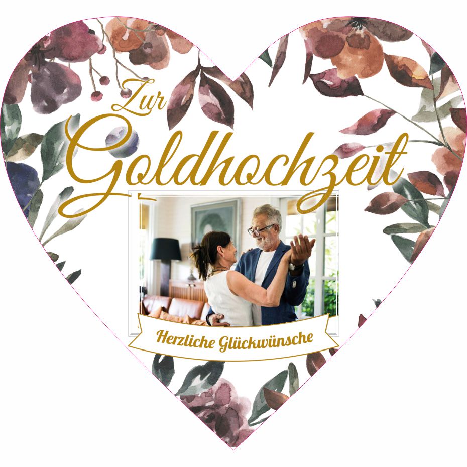 Bei dieser Vorlage können Sie das Bild in der Vorlage mit Hilfe unseres Konfigurators selbst ändern. Der Text ist mit „Zur Goldhochzeit“ und „Herzliche Glückwünsche“ voreingestellt.