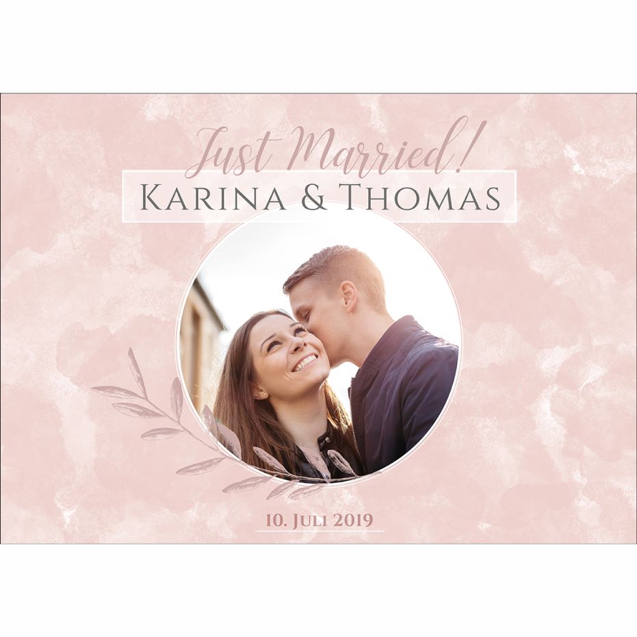 Bei dieser Vorlage können Sie das Bild in der Vorlage mit Hilfe unseres Konfigurators selbst ändern. Der Text ist mit „Just married“ voreingestellt, den Namen und das Datum können Sie mit dem Konfigurator selbst ändern.