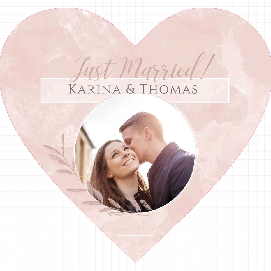 Bei dieser Vorlage können Sie das Bild in der Vorlage mit Hilfe unseres Konfigurators selbst ändern. Der Text ist mit „Just married“ voreingestellt. Den Namen und das Datum können Sie mit dem Konfigurator eingeben oder ändern.