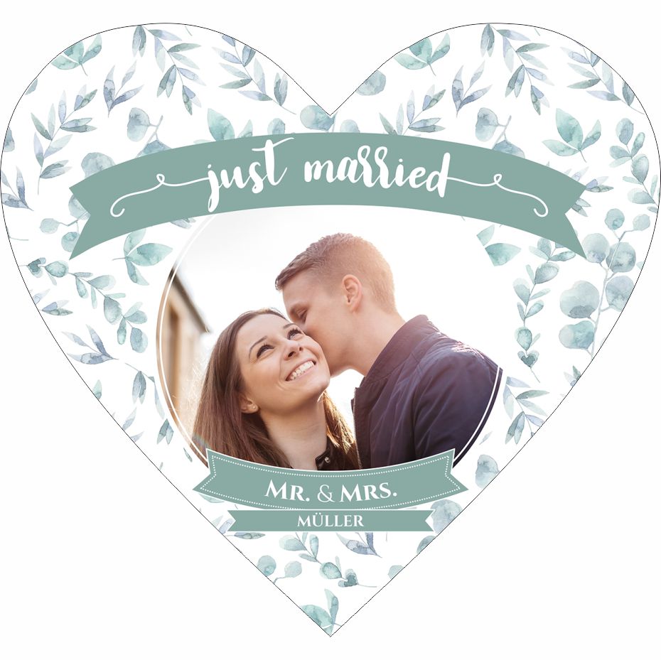 Bei dieser Vorlage können Sie das Bild in der Vorlage mit Hilfe unseres Konfigurators selbst ändern. Der Text ist mit „Just married“ und“ Mr. & Mrs.“ voreingestellt. Den Namen können Sie mit dem Konfigurator eingeben oder ändern.