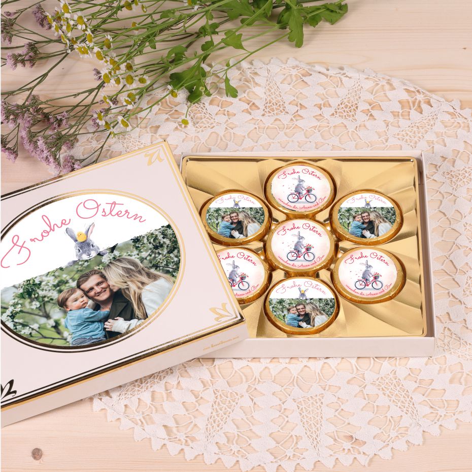 Ihr individuelles Bild ist sowohl auf den Schokotalern, als auch auf der Außenseite der Schachtel.