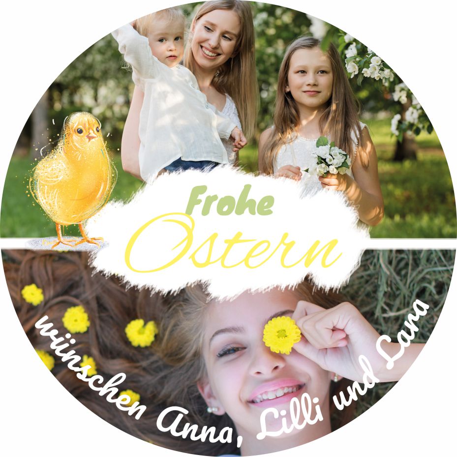 Bei dieser Vorlage können Sie zwei Bilder in der Vorlage mit Hilfe unseres Konfigurators selbst ändern. Der Text ist mit „Frohe Ostern“voreingestellt.