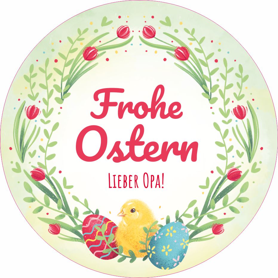 Bei dieser Vorlage können Sie den Wunschtext mit Hilfe unseres Konfigurators selbst ändern. Der Text ist mit „Frohe Ostern“voreingestellt.