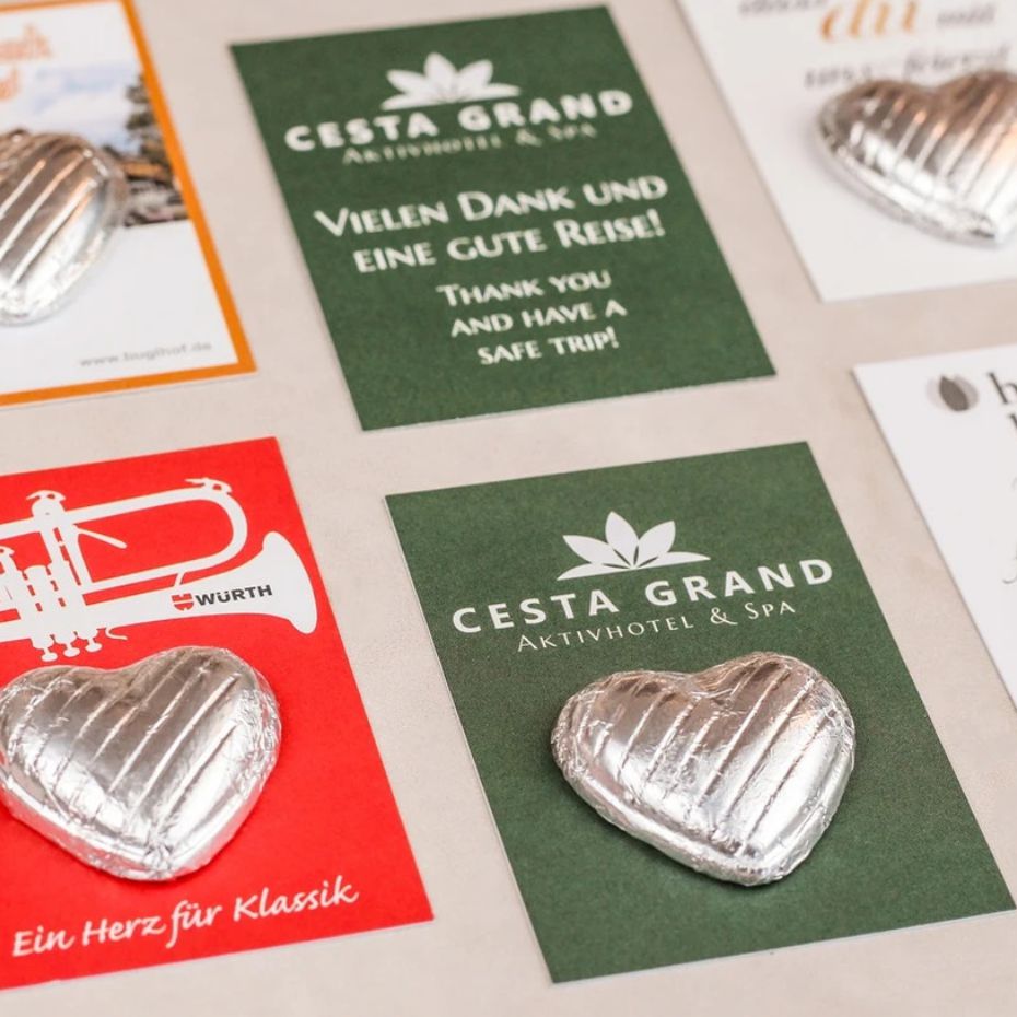 Sie erhalten individuelle Karten, auf die ein Schokoherz geklebt wird.