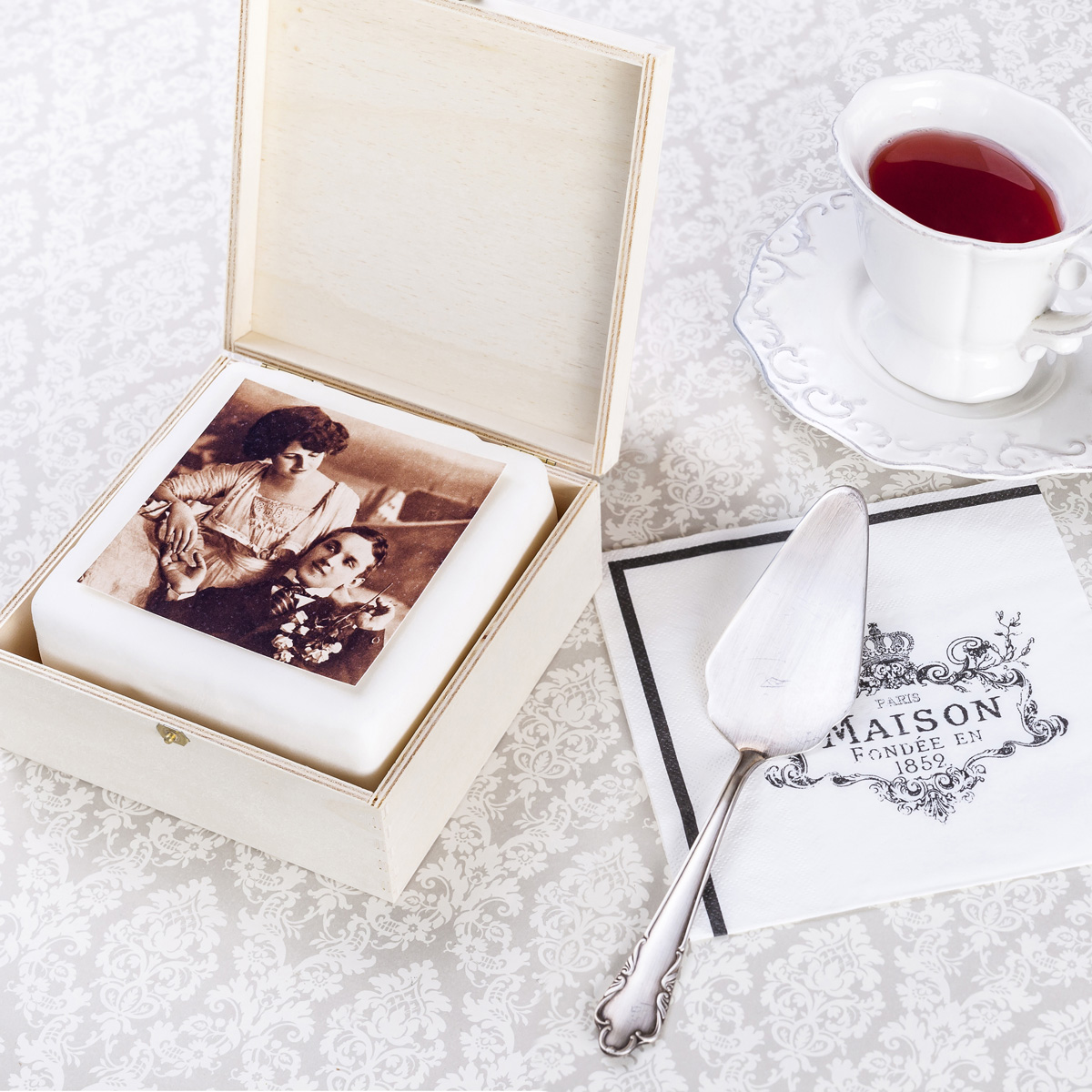 Schokotorte weiß 12x12cm in Holzkassette