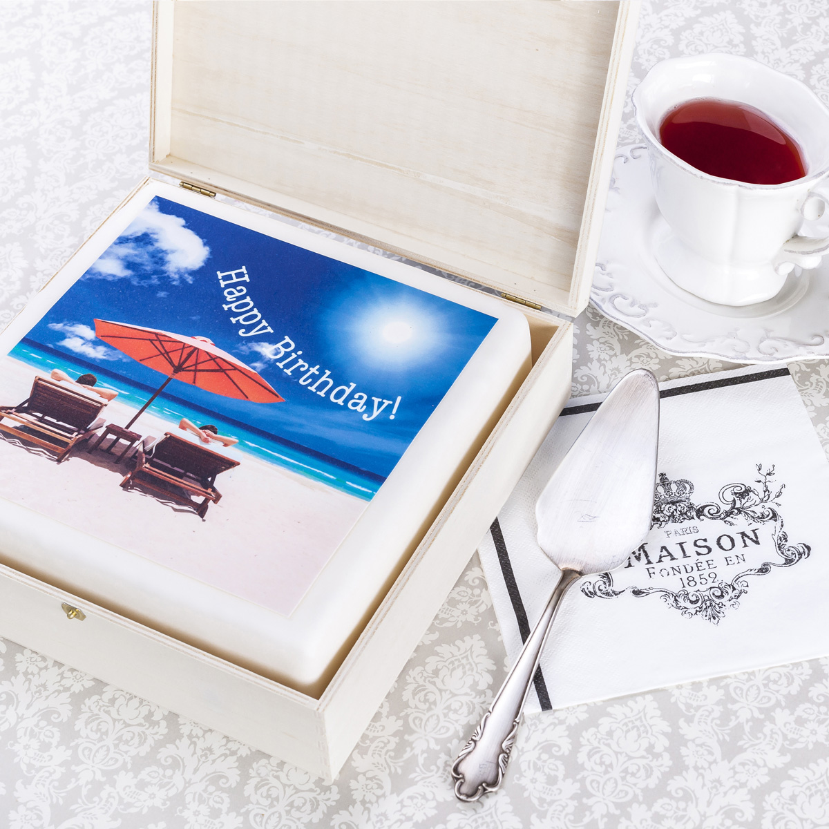 Auf der Sachertorte ist ein essbares Bild aus Zuckerpapier. Sie können selbst wählen welches Motiv auf die Torte gedruckt wird.