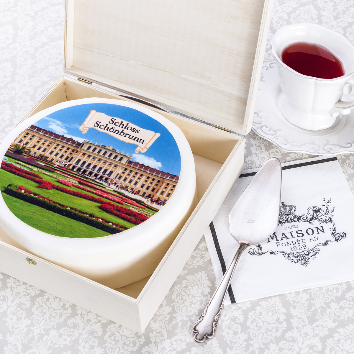 Die Sachertorte wird in einer Holzkassette verpackt und kann daher versendet werden. Der Versand erfolgt in einem weißen, neutralen Überkarton.