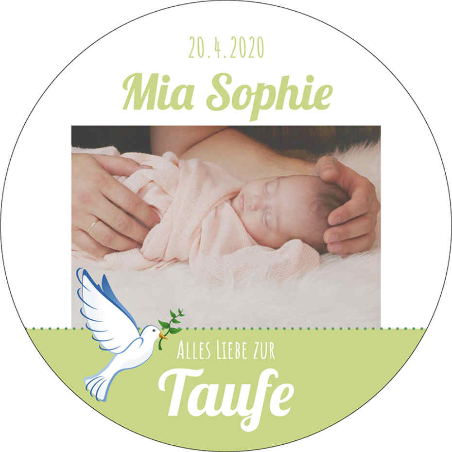 Bei dieser Vorlage können Sie das Bild in der Vorlage mit Hilfe unseres Konfigurators selbst ändern. Der Text ist mit „Alles Liebe zur Taufe“ voreingestellt. Den Namen und das Datum können Sie selbst mit dem Konfigurator ändern.