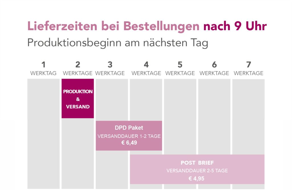Bitte beachten Sie, dass die Laufzeiten des Versandes erst ab Produktionsende des Auftrages beginnen.